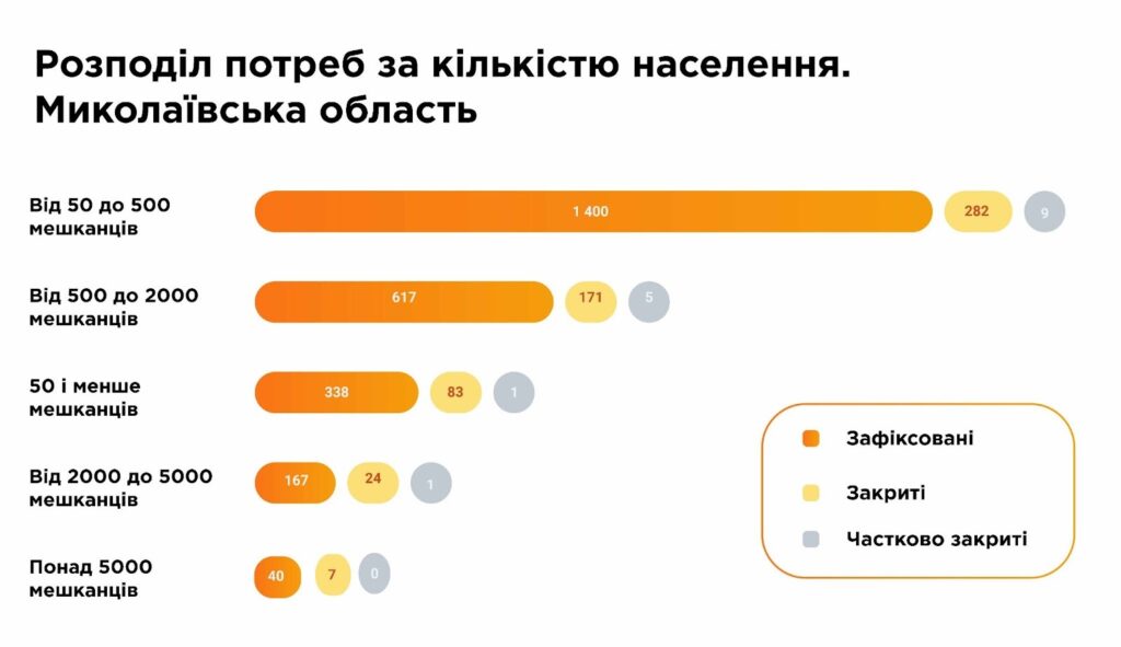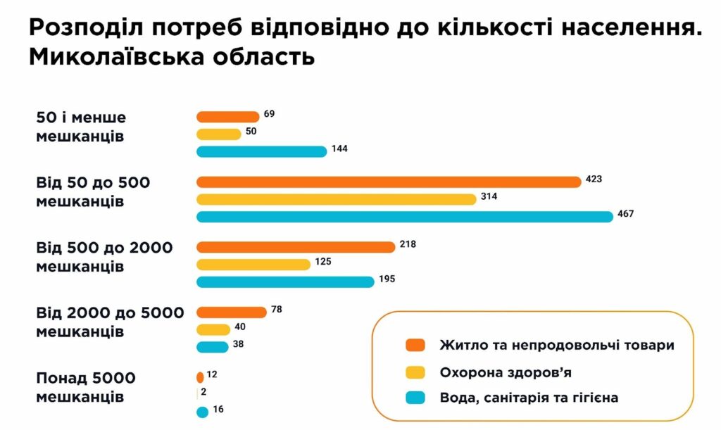 Суттєво більше потреб зафіксовано в населених пунктах, де мешкають від 50 до 500 осіб, що відображає більшу кількість населених пунктів такого розміру в Миколаївській області.