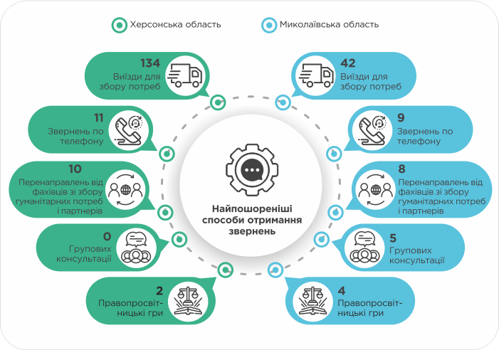 У Херсонській області зафіксовано 160 правових потреб, у Миколаївській — 79. Найчастіше юристи отримують звернення безпосередньо під час виїздів у населені пункти для збору інформації. Значно менша кількість звернень надходить телефоном, внаслідок перенаправлення від фахівців зі збору гуманітарних потреб та партнерів, під час групових консультацій і правопросвітницьких ігор. Частину звернень правники отримують через гарячу лінію, онлайн-чат, мессенджер, а також під час правопросвітницьких заходів, проте наразі це поодинокі випадки.