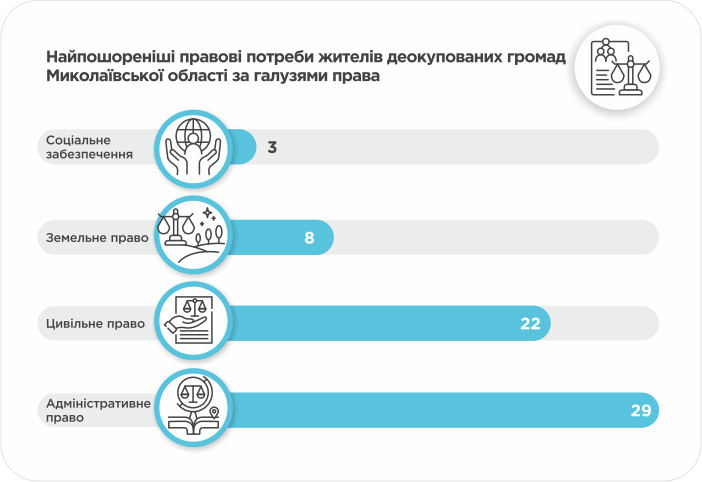 НАЙПОШИРЕНІШІ ПРАВОВІ ПОТРЕБИ ЖИТЕЛІВ ДЕОКУПОВАНИХ ГРОМАД МИКОЛАЇВСЬКОЇ ОБЛАСТІ ЗА ГАЛУЗЯМИ ПРАВА