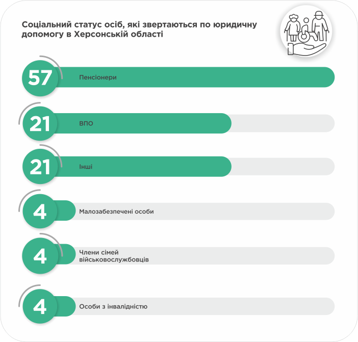 Щодо соціального статусу клієнтів, найбільше звернень від пенсіонерів — 57 запитів, від внутрішньо переміщених осіб — 21 звернення, по чотири — від малозабезпечених осіб, членів сімей військовослужбовців та осіб з інвалідністю. Два звернення — від осіб, які повернулися додому. «Інші» — 21 особа. 53 клієнти не ідентифікували свій соціальний статус. Загальна кількість соціальних статусів — понад 160, оскільки зустрічаються поєднання категорій. Наприклад, людина є одночасно ВПО та особою з інвалідністю, членом сім’ї військовослужбовця та особою з інвалідністю тощо.