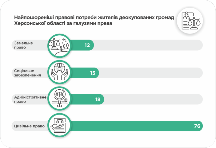 НАЙПОШИРЕНІШІ ПРАВОВІ ПОТРЕБИ ЖИТЕЛІВ ДЕОКУПОВАНИХ ГРОМАД ХЕРСОНСЬКОЇ ОБЛАСТІ ЗА ГАЛУЗЯМИ ПРАВА
