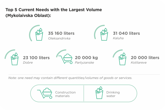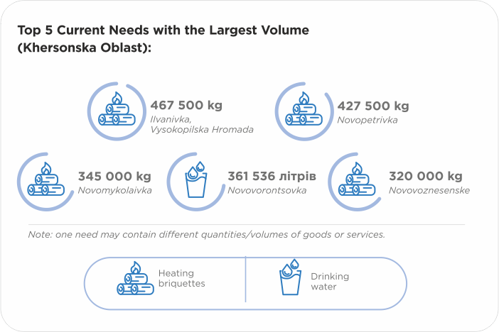 The largest number of needs was recorded in Vysokopilska Hromada, Beryslavskyi District, Khersonska Oblast — 678. In Bereznehuvatska and Shevchenkivska Hromadas of Mykolaivska Oblast, as well as in Novovorontsovska, Kochubeivska, Velykooleksandrivska, and Bilozerska Hromadas of Khersonska Oblast, more than 400 needs were recorded.