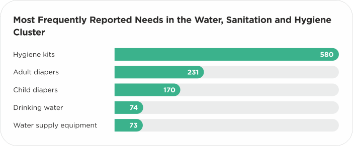 Within the “Water, Sanitation and Hygiene” cluster, the most common needs are hygiene kits, adult and child diapers, drinking water, as well as water supply equipment.