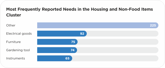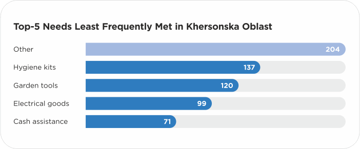 Among the least satisfied needs are hygiene kits, gardening tools, electrical appliances, cash assistance, and again the “Other” category, which included requests for equipment (a school bus, an excavator, a vehicle) and small household items (paper, power banks, extension cords, a kettle). The fact that the need for hygiene kits appears on both lists shows the large number of requests for this type of assistance.