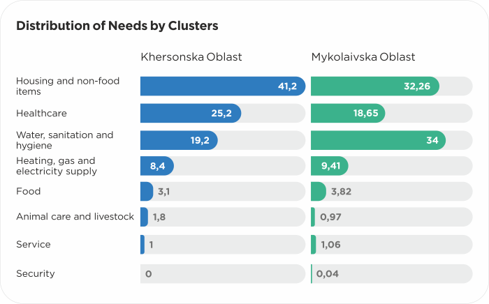 In both Khersonska and Mykolaivska oblasts, three clusters — housing and non-food items, healthcare, water, sanitation and hygiene — are the leaders in terms of the number of needs, with a significant gap from the others. In Khersonska Oblast, these clusters account for 85% of all needs, while in Mykolaivska Oblast — 74%.