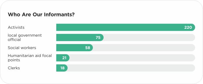 Informants are people of different professions and social status who live in hromadas. Among them are activists and volunteers, social workers, heads of schools and kindergartens, representatives of local self-government, feldshers, and heads of libraries. The table below contains the most common positions of informants.