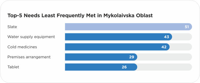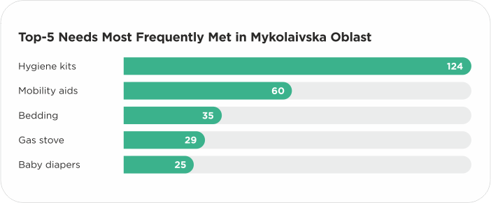 In Mykolaiv Oblast, hygiene kits are also among the top five needs most frequently met, but they are absent from the least met list. In addition, frequently met needs in the oblast include mobility aids, bedding, a gas stove, and baby diapers.