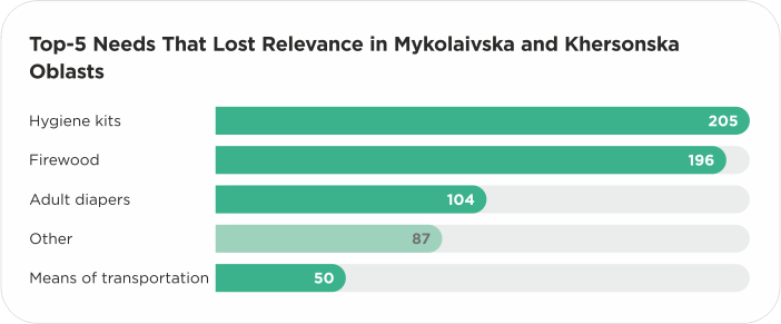 We also analysed the most common needs among those that lost relevance across all hromadas. Hygiene kits, mobility aids, and adult diapers again appear among the top five needs, indicating their large number. The loss of relevance of firewood requests points to their seasonality. In this case, the “Other” category includes financial assistance, specific medicines, agricultural goods, etc.