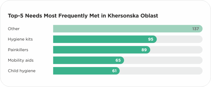 Among the largest number of needs met in Khersonska Oblast are hygiene kits, painkillers, mobility aids, child hygiene items, and the “Other” category, which in this case included various specific medicines and supplies.