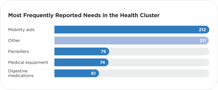 The Top 5 needs in the “Healthcare” cluster are mobility aids, painkillers, medical equipment, digestive medications, and “Other”. The “Other” subcluster in this case covers a wide range of medical requests that do not fall under other categories. For example, arranging appointments with doctors (dentist, ophthalmologist, cardiologist), a hearing aid, insulin (noting that there is no pharmacy or feldsher-midwife station (FAP) in the village), a commode chair, or leg prosthesis replacement.