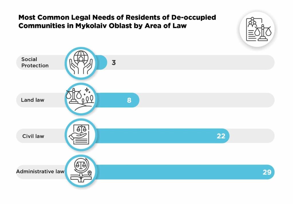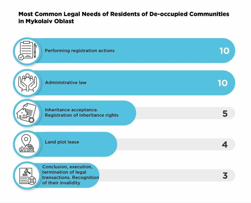 In Kherson Oblast, the greatest number of needs were recorded in the area of civil law. Specifically, the procedure for documenting damage to receive compensation for damaged or destroyed property, registration of property rights to real estate, restoration of lost documents, and conclusion and termination of legal transactions. Many requests concern inheritance: its acceptance, inheritance of damaged property, drafting wills, and recognition of property rights to inherited property.