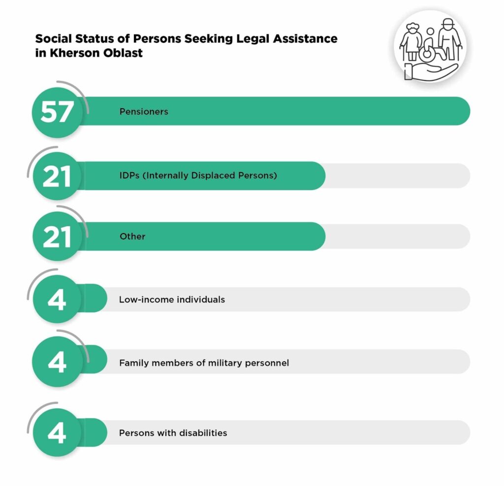 Regarding clients’ social status, the most requests are from pensioners—57 requests, from internally displaced persons—21 requests, four each from low-income individuals, family members of military personnel, and people with disabilities. Two requests—from people who returned home. “Other”—21 people. 53 clients did not identify their social status. The total number of social statuses is greater than 160, as combinations of categories occur. For example, IDP and person with disability, family member of military personnel and person with disability, etc.