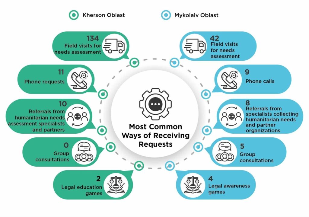In Kherson Oblast, 160 legal needs were recorded, and in Mykolaiv Oblast—79. Most often, lawyers receive requests directly during field visits to settlements to gather information. A significantly smaller number of requests come by phone, through referrals from humanitarian needs assessment specialists and partners, during group consultations, and legal education games. Some requests are received through the hotline, online chat, messenger, and during legal education events, though these are currently isolated cases.