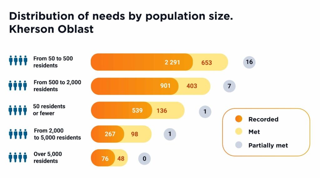 The number of recorded needs corresponds to the number of settlements: the highest number was recorded in settlements with a population of 50 to 500 people, while the lowest was recorded in a single settlement with more than 5,000 residents.