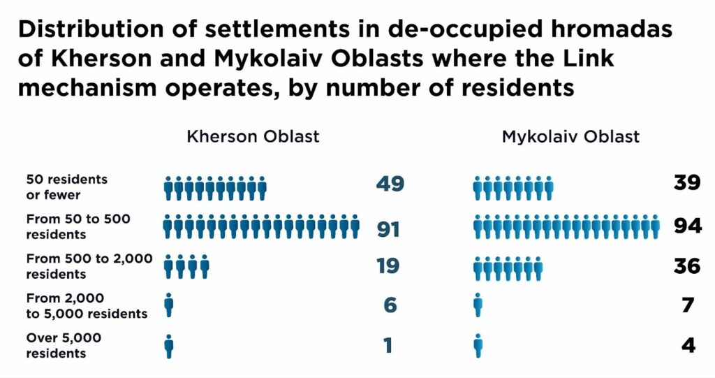 The Link local coordination mechanism for humanitarian response has been implemented for three years by the Legal Development Network in cooperation with the Czech humanitarian organization “People in Need,” with funding from the UK government. Link collects and verifies the needs of residents in de-occupied hromadas in Southern Ukraine, aiming to cover all settlements. We analyze how many people have already received assistance through Link and whether needs depend on the size of the settlement.