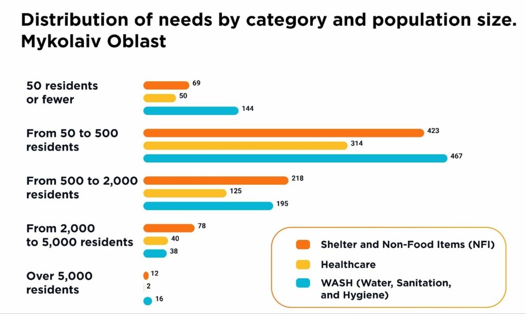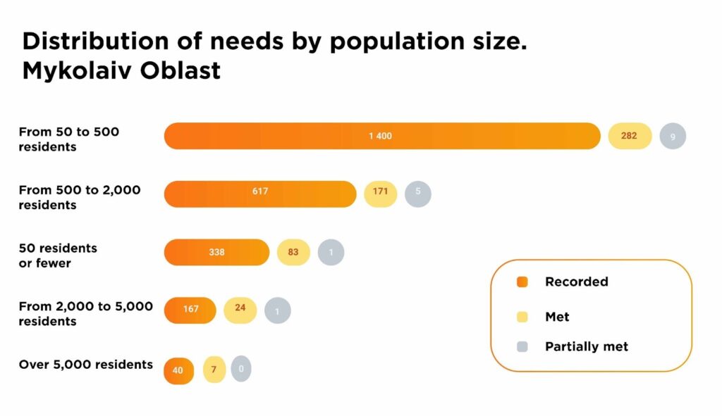 Significantly more needs were recorded in settlements with a population of 50 to 500 people, reflecting the larger number of settlements of this size in Mykolaiv Oblast.