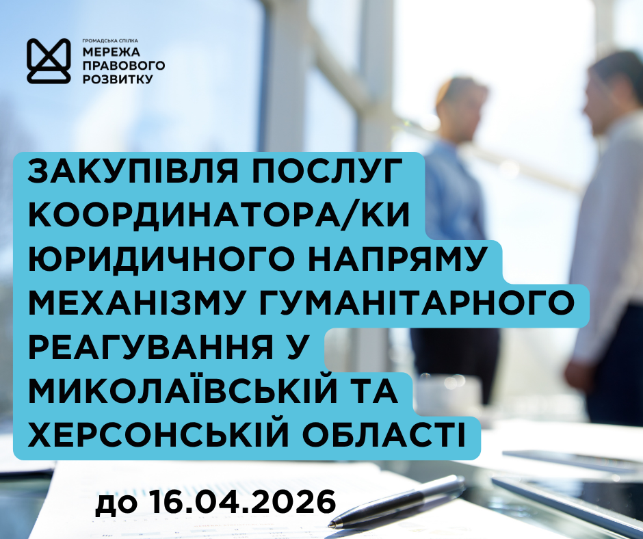 У зв’язку із розширенням впроваджуваних ініціатив МПР запрошує підрядників послуг подати цінову пропозицію на закупівлю послуг координатора/ки юридичного напряму механізму гуманітарного реагування у Миколаївській та Херсонській області